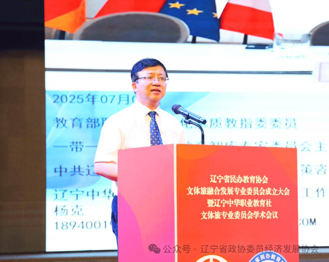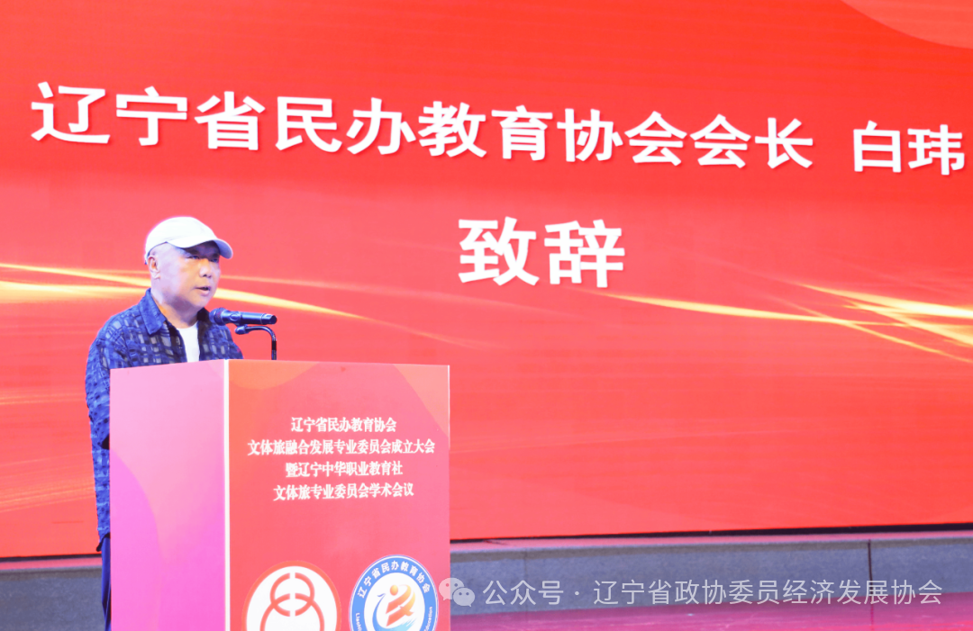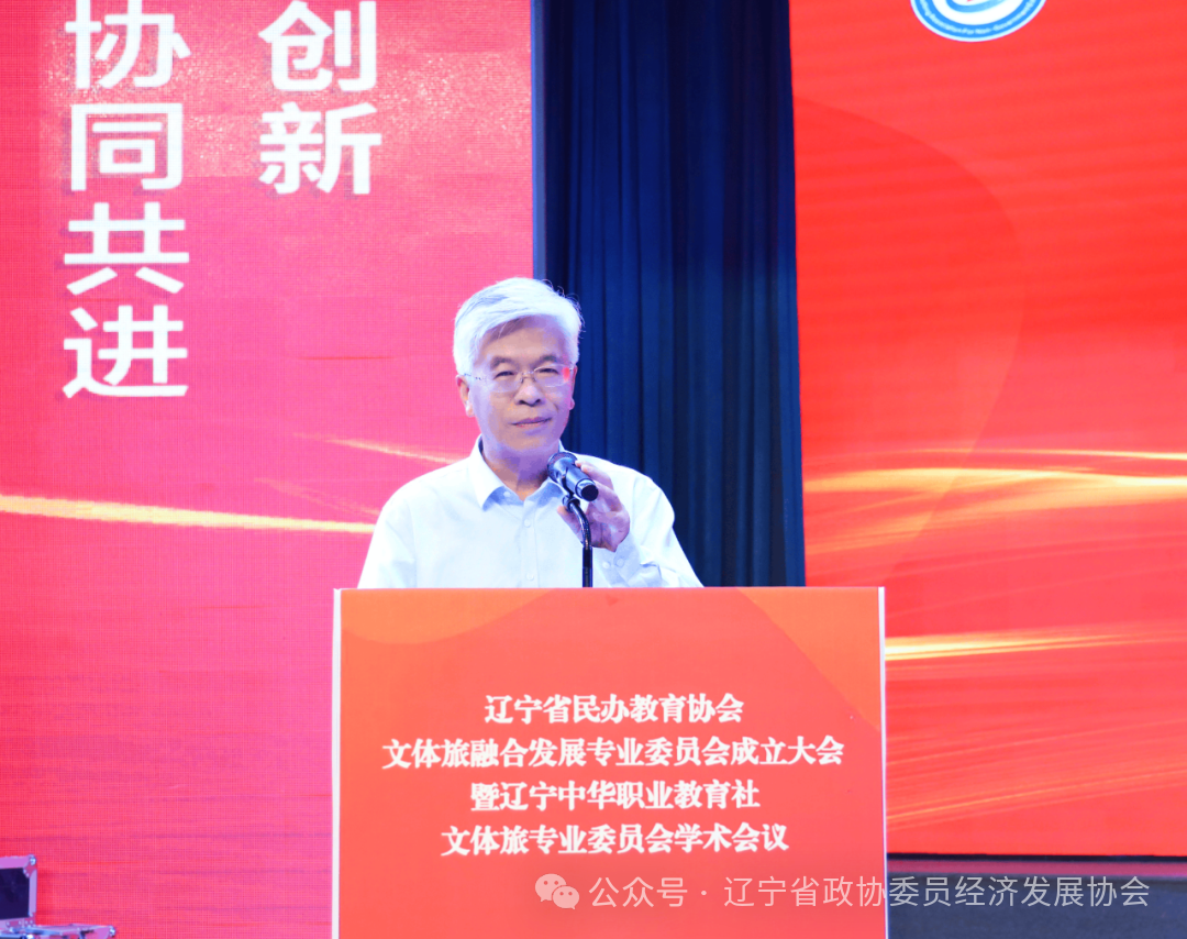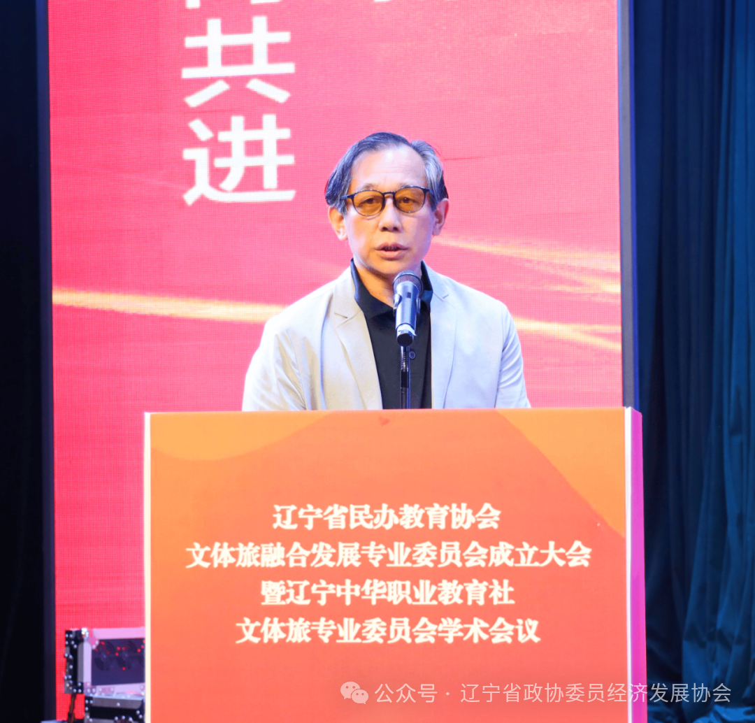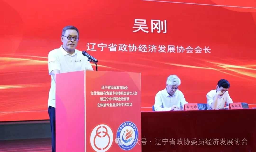 辽宁省政协委员经济发展协会吴刚会长在致辞中首先向会议的举办致以热烈祝贺,并表示:省委、省政府、省政协坚决贯彻新时代推动东北全面振兴座谈会精神,将文体旅融合作为构建现代化产业体系的重要引擎。协会将紧随省委、省政府、省政协指示发挥协会“协商平台”与“纽带桥梁”作用,一是强化政策协同:联合专委会开展文体旅产业政策调研,向省委、省政府提交专项建议;二是搭建供需枢纽:组织“政企校”三方对接会,推动人才链、产业链、创新链深度融合;三是优化要素供给:联合金融机构设立文体旅人才培养专项基金,破解校企合作瓶颈。
