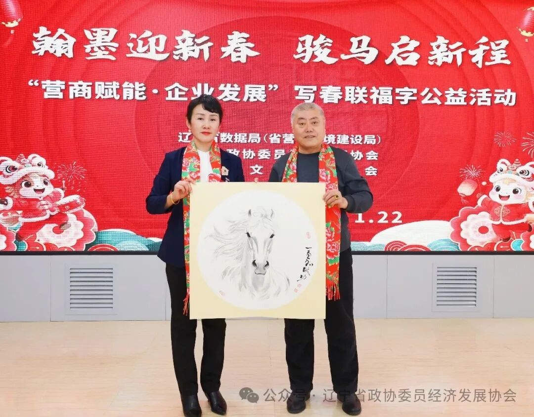 2026年1月22日,辽宁省政务服务大厅墨香四溢、春意盎然。由辽宁省数据局(省营商环境建设局)、辽宁省政协委员经济发展协会、辽宁省文化交流协会联合主办的“翰墨迎新春·骏马启新程”营商赋能企业发展——写春联福字公益活动在这里温暖启幕。20余位书画名家挥毫泼墨,50余位辽宁企业家与人大代表、政协委员、市民群众百余人共聚一堂,累计送出春联近200副、“福”卡400余张,以千年文脉为纽带,让政企民心在纸墨间同频共振。